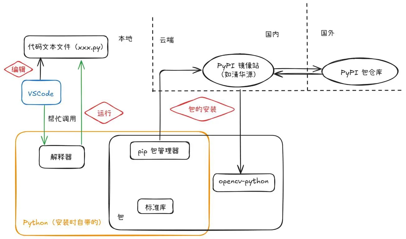 import的软件包基本都不会默认安装到你的电脑,需要通过 pip 包管理器下载 - PyPI 包仓库:托管绝大多数的 Python 包的网站,pip 默认就从这个网站下载 Python 包,但因为服务器位于国外所以下载速度相当慢